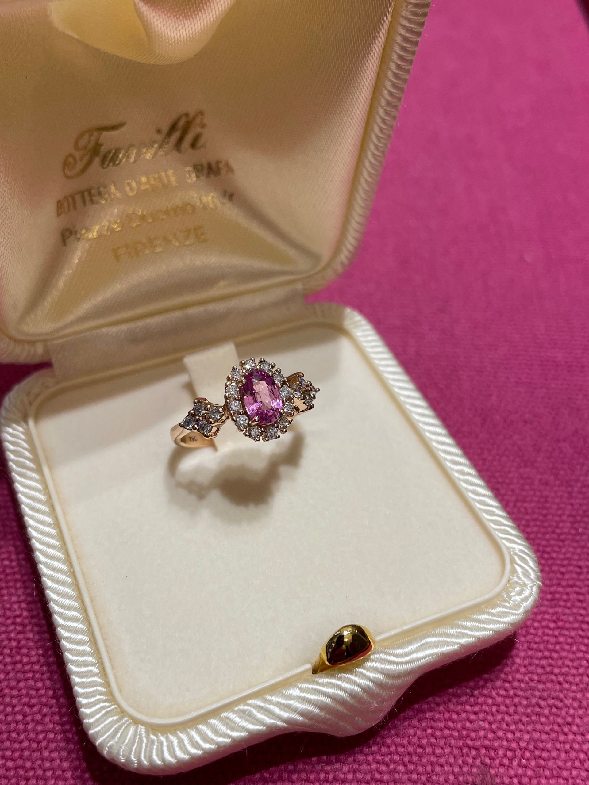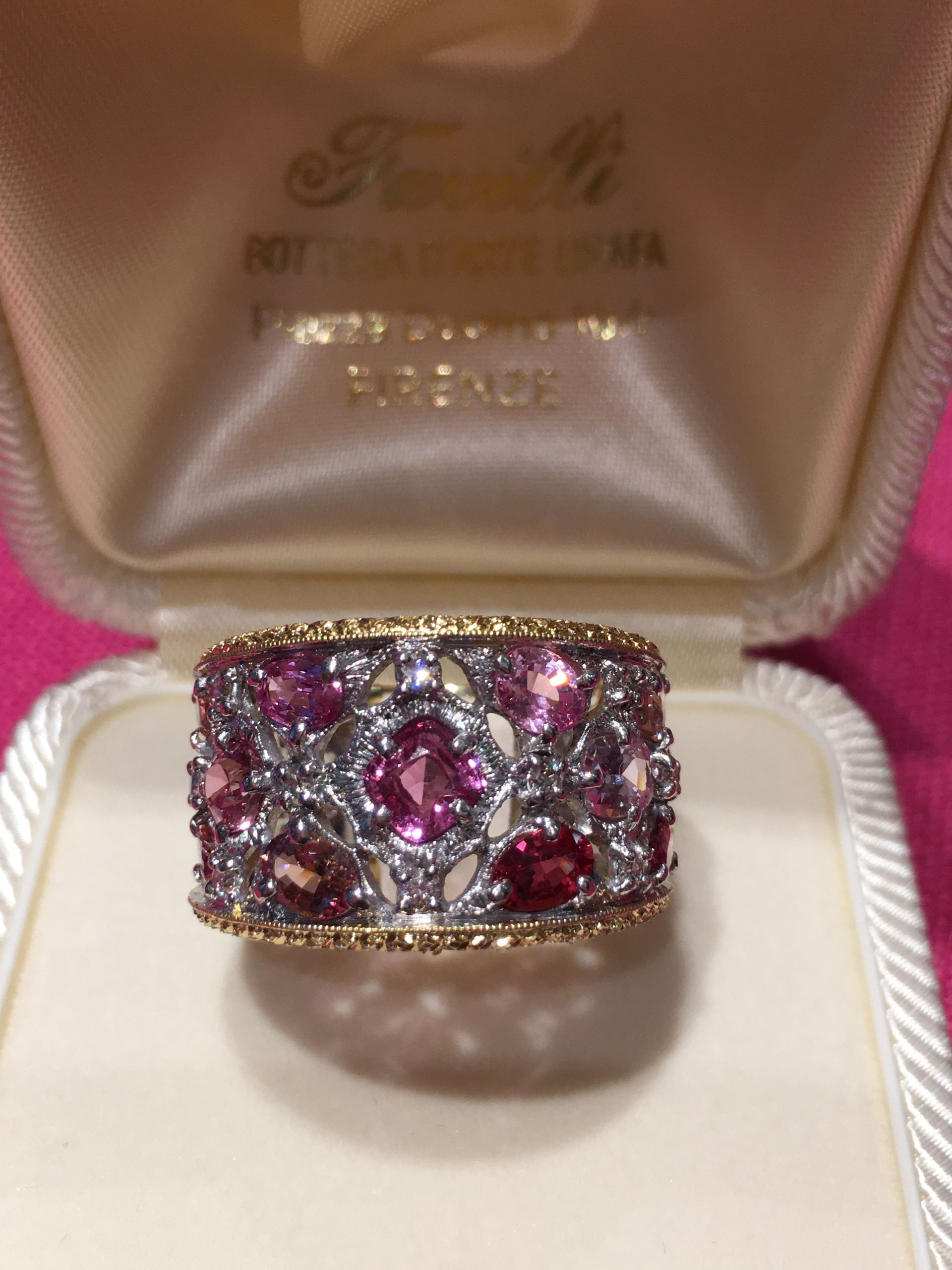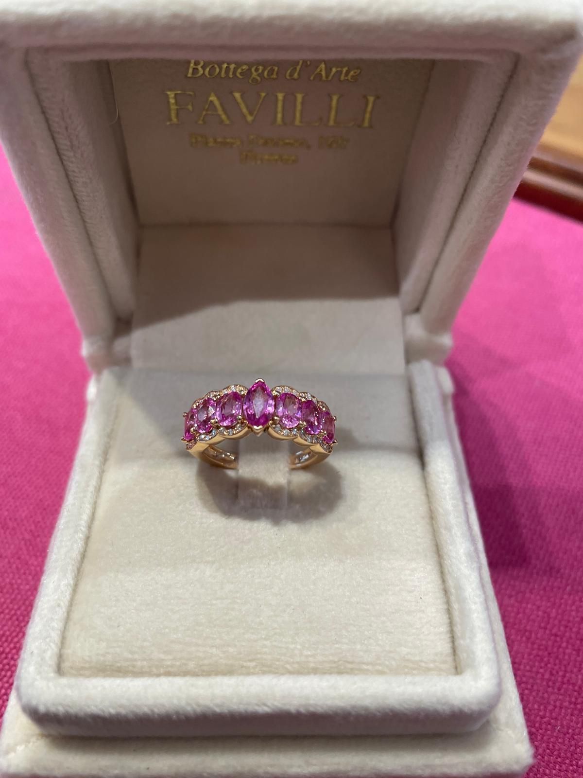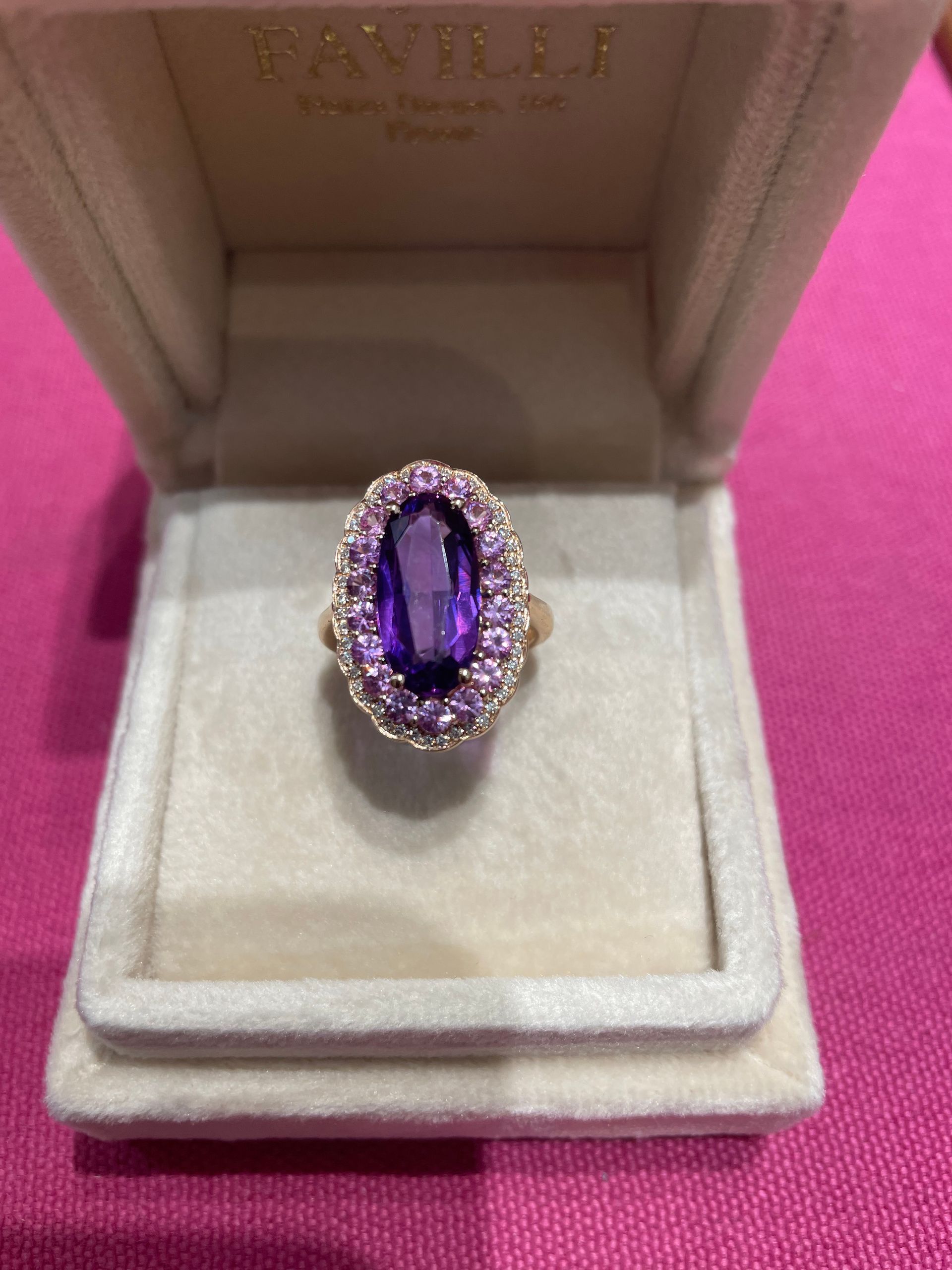 Anello in oro con brillanti, zaffiri rosa e ametista